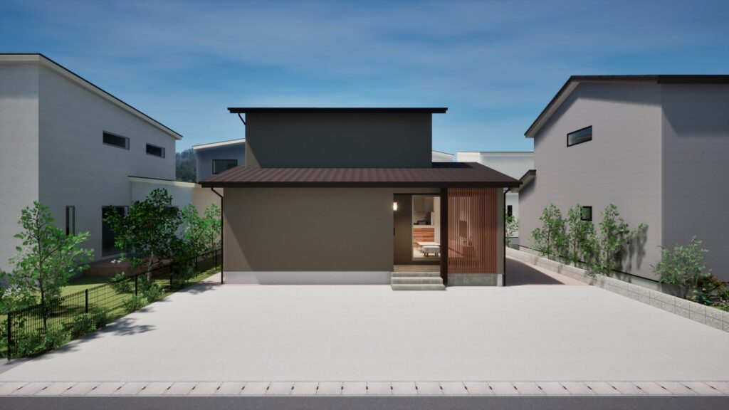 落ち着いた色調の外壁に、繊細な格子が和の趣を添える平屋風の外観です。計算された軒の深さが生む陰影と、窓から漏れる温かな光が、帰宅する家族を優しく迎え入れます。周囲の景観に調和しながらも、凛とした気品が漂う、大人のためのモダンな住まいです。