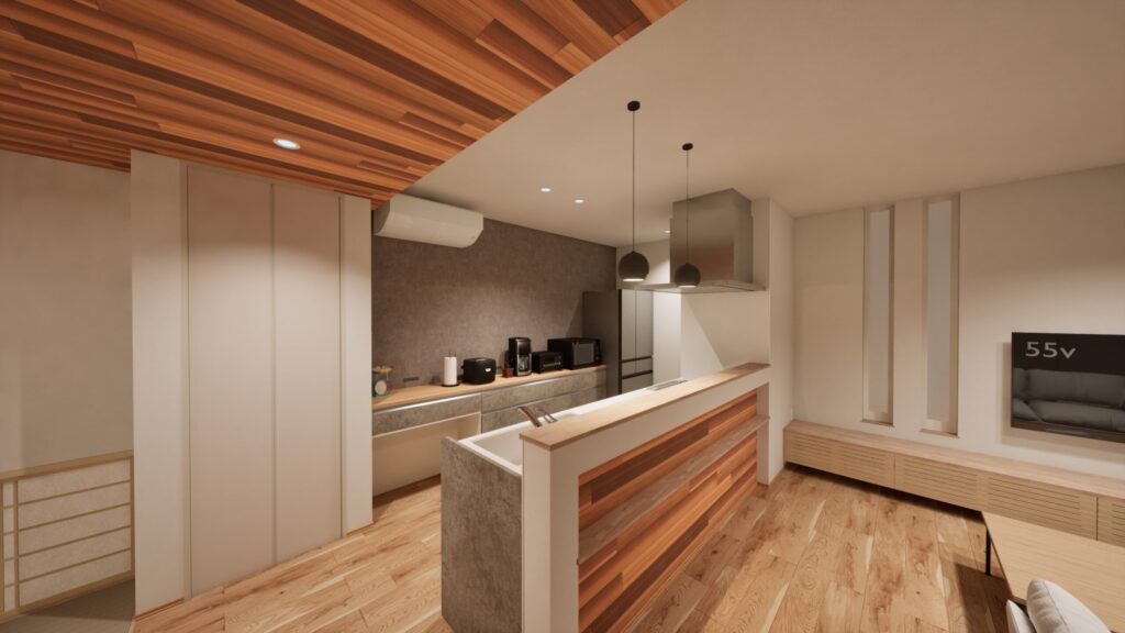 LDKに入るとまず目を引くのは、空間のアクセントとなる木目の下がり天井。 落ち着いたグレーのクロスと温かみのある木材が調和し、洗練された中にも安らぎを感じさせます。 外観には和のテイストを感じるルーバーをあしらい、街並みに馴染みながらも個性を主張します。