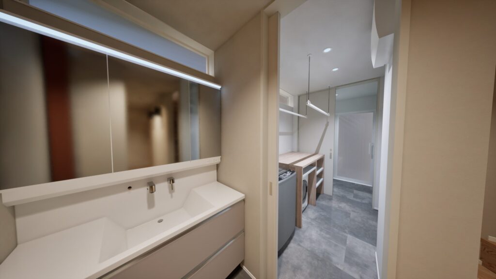 広々とした洗面台に加え、室内干しスペースと作業カウンターを隣接させることで、「洗う・干す・畳む」が最短距離で完結します。グレーを基調とした清潔感のあるデザインと、機能的な収納計画が、日々の暮らしを美しく整えてくれる家事ラク設計です。