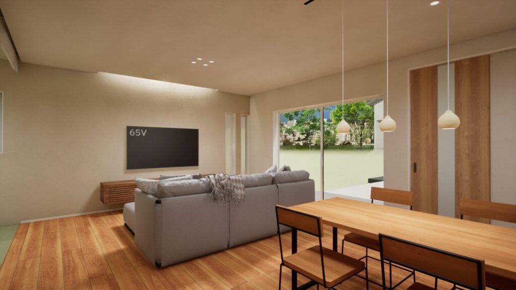 木の質感を活かしたフローリングに柔らかな間接照明が灯るナチュラルモダンな空間は、庭へと続く大開口からの豊かな採光と、リビング・ダイニングを緩やかにつなぐ配置によって、家族の気配と四季の彩りを常に感じられる洗練された住まいを実現しています。