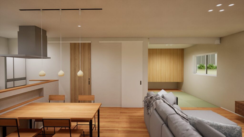 キッチンからリビング、そして奥の畳コーナーまでが一直線に繋がる開放的なフラット動線を採用したこの空間は、料理をしながら部屋全体を見渡せる対面式キッチンや、家族の食事を優しく照らすペンダントライト、そして暮らしに奥行きを与える多目的な畳スペースにより、常に家族の気配を感じながら心地よく過ごせる住まいを実現しています。