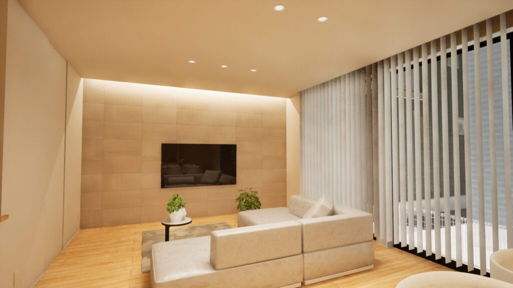 - ◆ TV壁面に施された繊細な間接照明とお施主様お気に入りのタイル