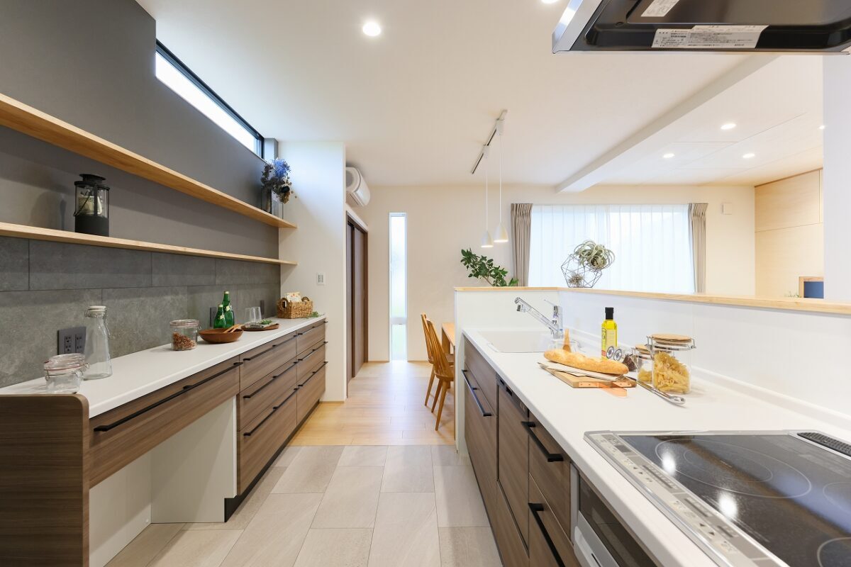 調理をしながら室内全体を見渡せるため、家族の様子を確認しやすく、会話も自然に生まれます。カウンターを設けることで配膳がスムーズになり、手元を隠す立ち上がりを設ければ生活感も軽減できます。